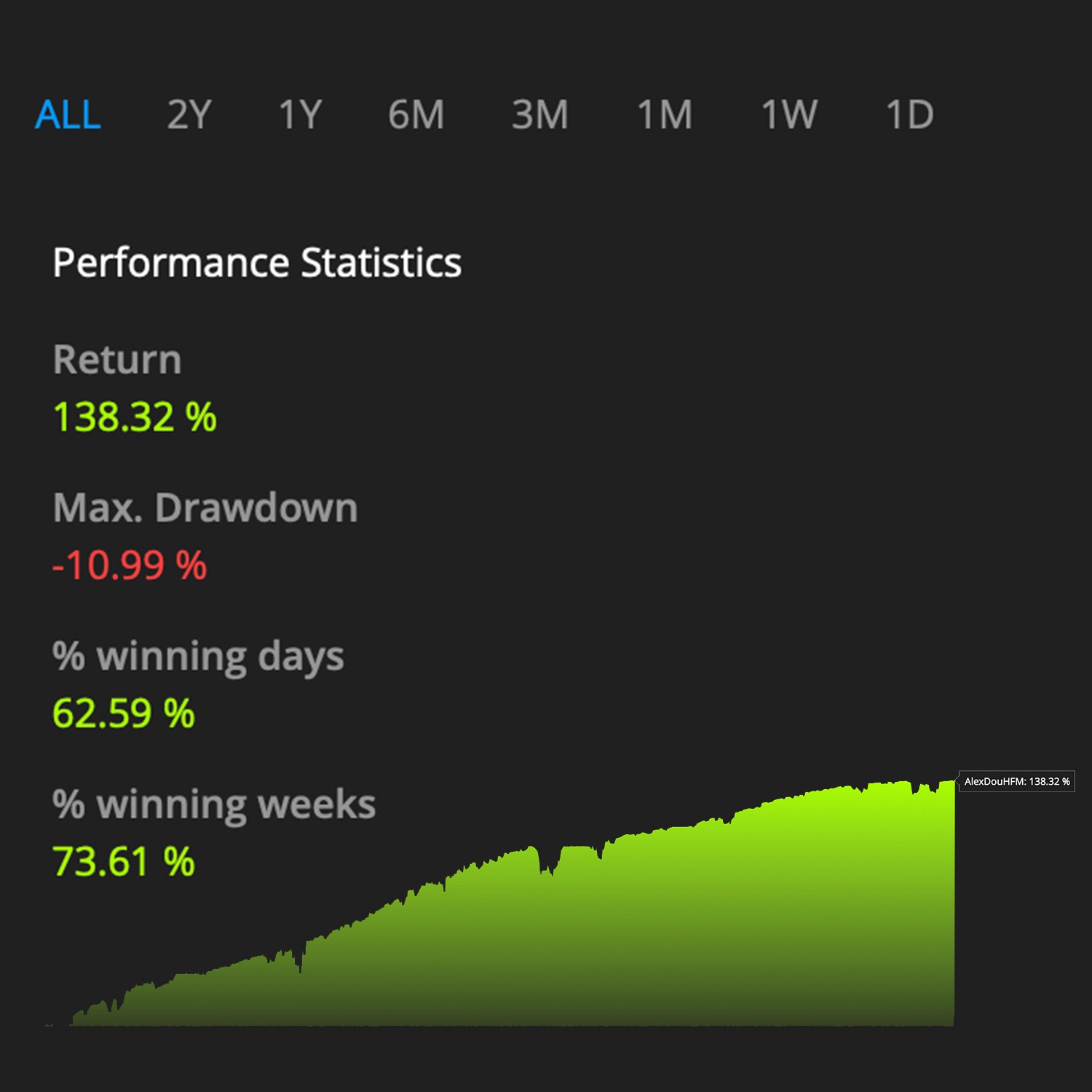 Ja. Die Strategie wurde über Darwinex verifiziert – mit einer dokumentierten Gesamtperformance von +138 % über reale Marktzyklen. Das ist kein Versprechen, sondern ein nachweisliches Ergebnis.